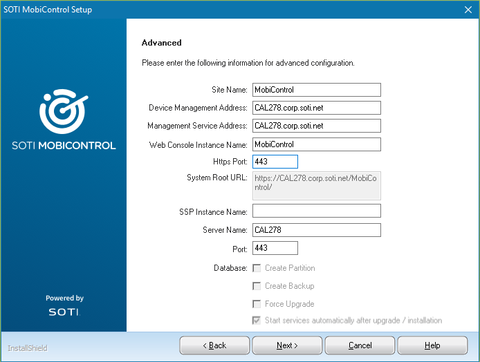 Site Name Change the automatically configured site name of the SOTI MobiControl deployment. Device Management Address Change the automatically configured address that Android and Apple devices use for connectivity. The address must be in either FQDN or IP format. Web Console Instance Name Enter a name for your SOTI MobiControl console instance. Note: If left blank, the System Root URl will be generated based on the Device Management Address.HTTPS Port Enter the port number of the HTTPS connection. System Root URL Displays the system root URL. SSP Instance Name Enter a name for your Self Service Portal instance. Deployment Server Name Enter a name for your deployment server. Port Enter a port number for the connection to the deployment server. Database: Create Partition When enabled, the database is divided into 14 partitions to optimize data collection. See Database Partitioning for more information.