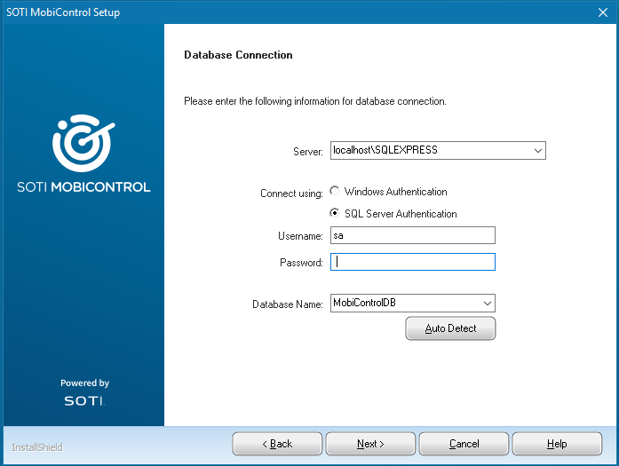 Password Enter the password for the account that SOTI MobiControl will use to access the database. Database Name Enter the name of the database. Auto Detect Click this button to retrieve the database name automatically using the provided information to attempt a connection. - Optional: