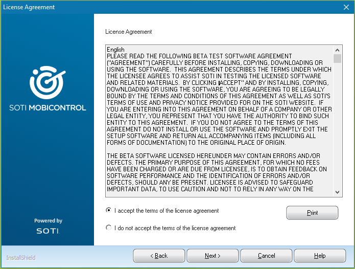 Read and accept the SOTI MobiControl license agreement. If desired, you can print the license agreement for future reference. Click Next.