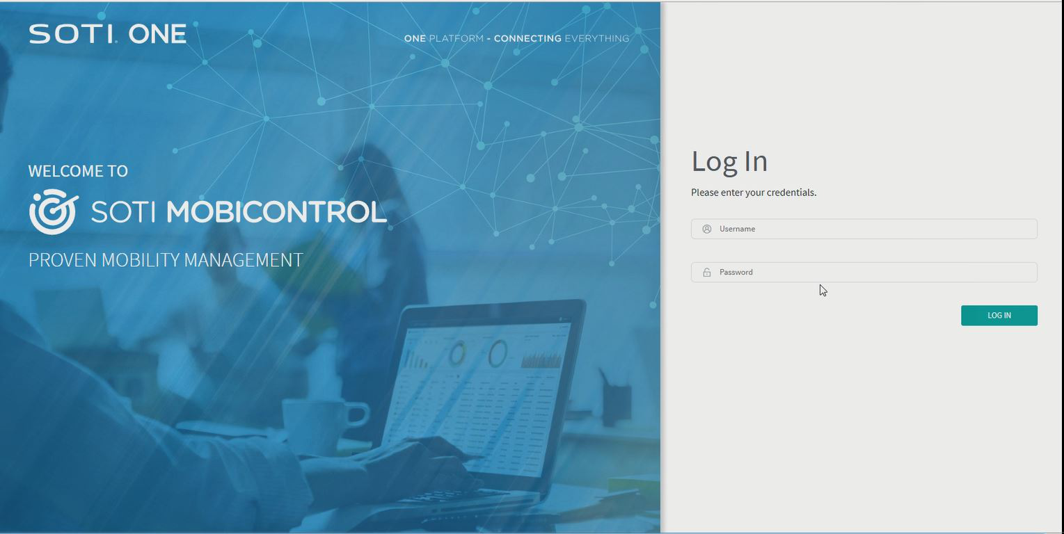 - Launch the SOTI MobiControl console: In a web browser, go to the System Root URL or managementServiceAddress/SOTI MobiControl.
