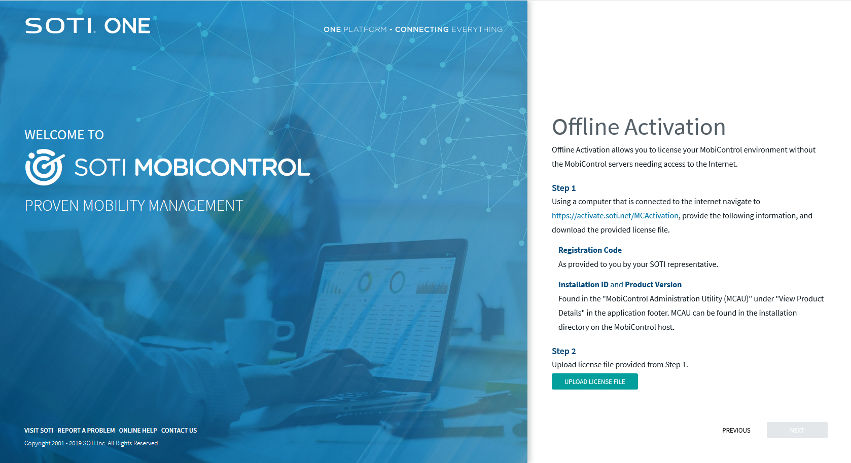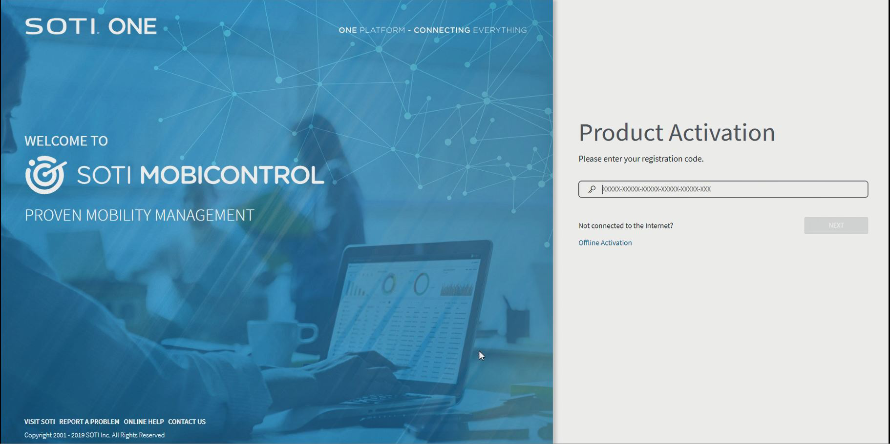 On the Product Activation page, enter the registration code you received from your SOTI representative. Click Next.