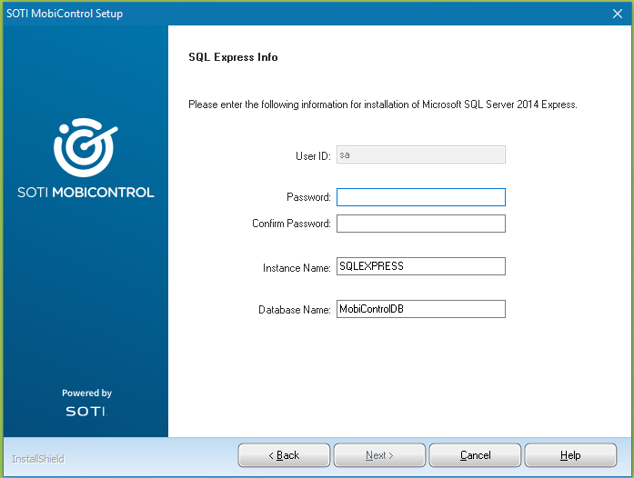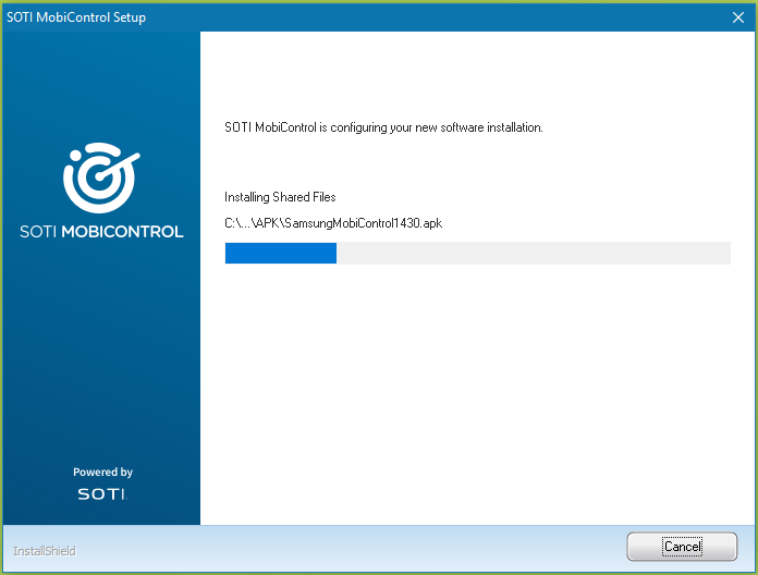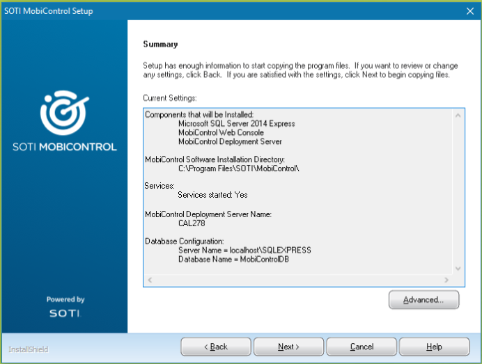 Database: Create Backup When enabled, creates a backup of the database. Configure the backup's location on the SQL Server instance. Database: Force Upgrade When enabled, forces the database to upgrade. Database: Start services automatically after upgrade / installation When enabled, services start immediately after SOTI MobiControl is installed. Tip: Disable this setting when performing installations or upgrades across multiple servers since you need to stop services to perform each new installation. Start services after all servers have been updated.The installation should take roughly ten to fifteen minutes. If you chose to install Microsoft SQL Server 2014 Express, it will install as part of the main SOTI MobiControl installation and take an additional few minutes.