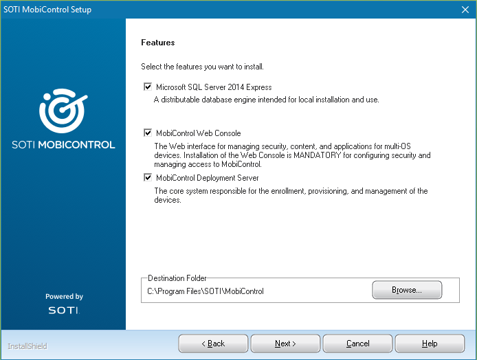 Click Browse if you want to to change the destination folder from the default C:\Program Files\SOTI\MobiControl. Click Next.